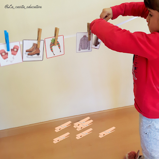 Entra las diferentes tarjetas encontramos prendas de vestir de las diferentes estaciones del año, ellos deben saber cuales pertenecen al invierno y colgarlas con pinzas en la cuerda tal y cómo se ve en las imágenes.