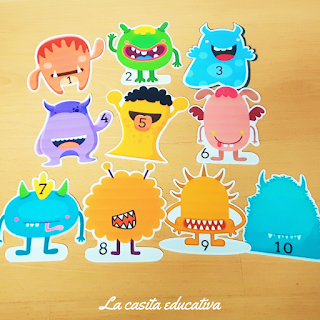Cada monstruito marca un número, el cual el niño debe de conocer y enganchar en el monstruo correspondiente el número de ojos que este marca.