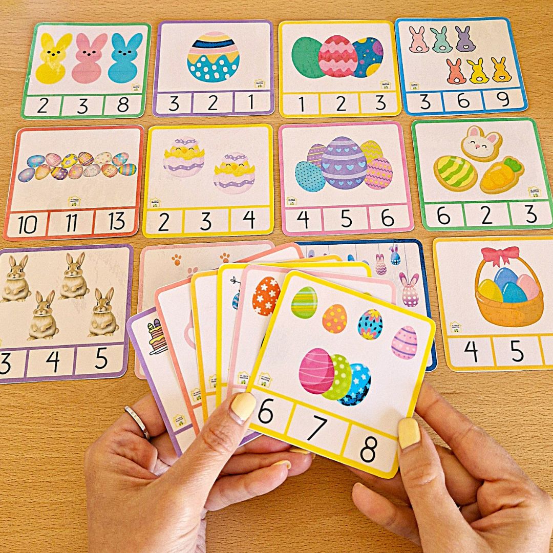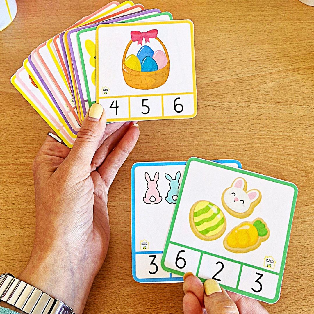 Los niños tendrán que contar cuántos elementos hay en cada tarjeta y con pinzas, rotulador o el objeto que les vaya mejor marcar cual es el número correcto de ilustraciones que hay.