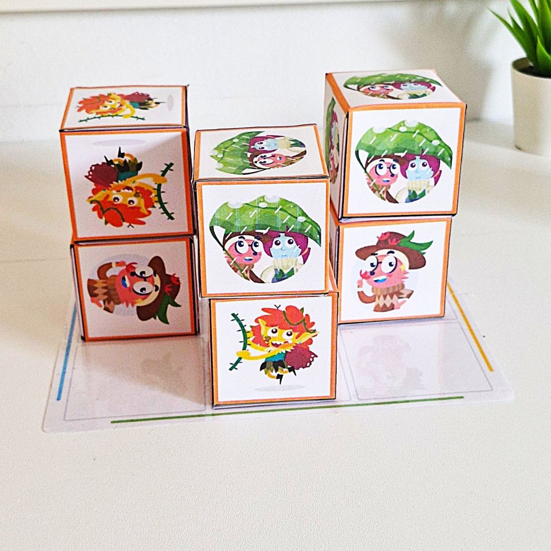 A través de tarjetas con vistas con colores (verde, amarillo, rojo y azul), los niños desarrollan la percepción espacial, interpretan la información visual y reproducen correctamente cada estructura utilizando los diferentes cubos Bmath.
