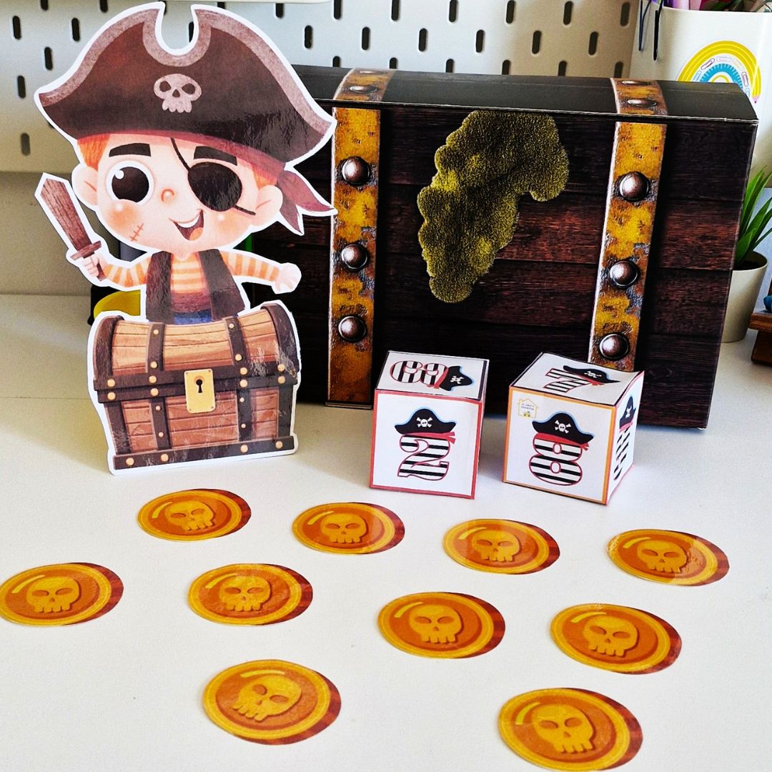 Este juego manipulativo de piratas es un recurso educativo ideal para trabajar el conteo del 1 al 12 para infantil de forma divertida y manipulativa. Los niños deberán lanzar el dado, contar las monedas correspondientes y colocarlas dentro del cofre del pirata.