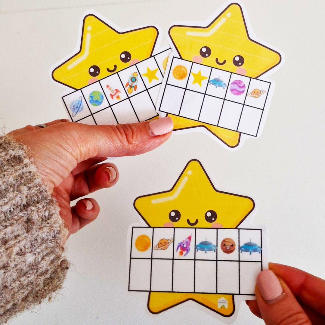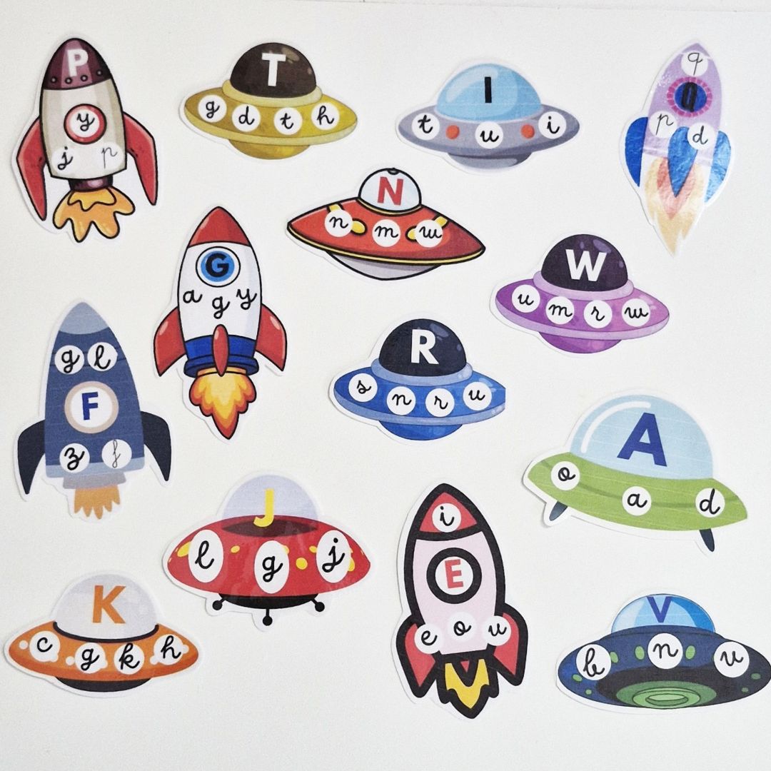 Las plantillas de las naves espaciales y los ovnis contienen X letra mayúscula y varias opciones de letras en minúscula, los niños tienen que asociar la letra mayúscula con su minúscula correspondiente.