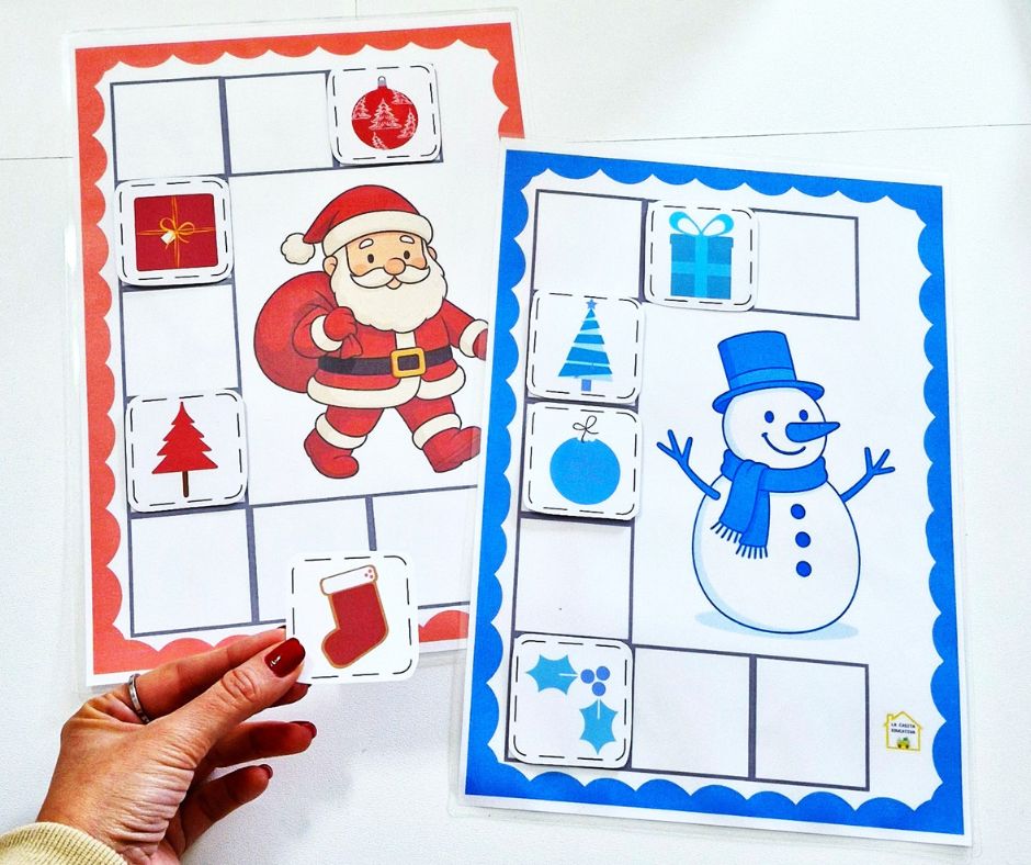 La actividad consiste en ir cogiendo las mini tarjetas con diferentes elementos de la Navidad e ir colocándolas en el Papá Noel o muñeco de nieve del color correspondiente. Al mismo tiempo tienen que decir de qué color se trata.