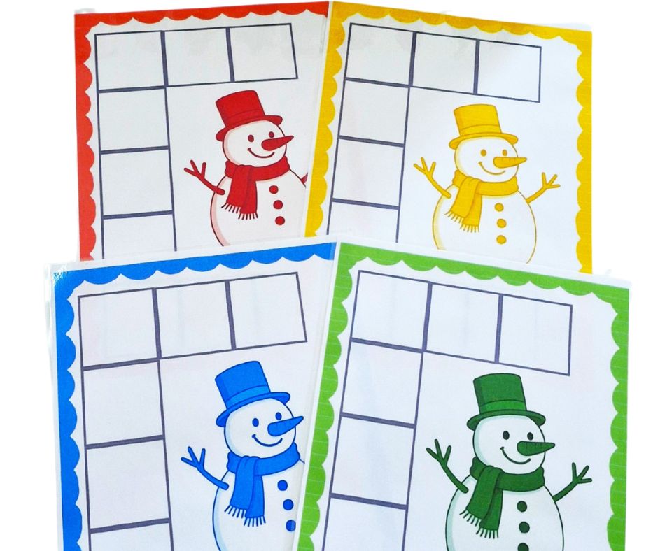 - 4 Plantillas DINA4 con ilustraciones de un muñeco de nieve en 4 colores.