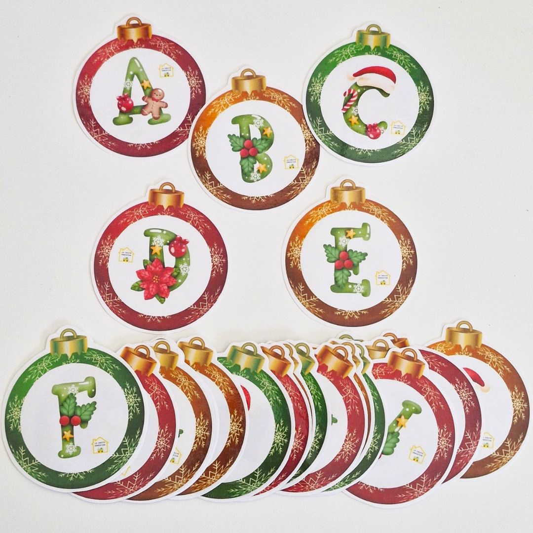 - 26 bolas navideñas con las diferentes letras del abecedario para crear el rosco de navidad. (El rosco puedes hacerlo como más te guste, con cartón, usando un aro, etc).