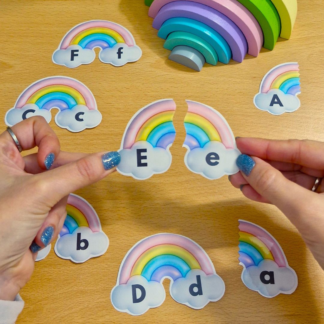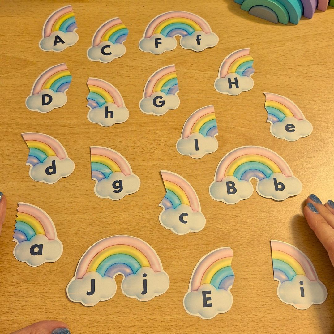 Primero de todo recortamos los diferentes arcoíris y seguidamente cortamos por la mitad realizando la forma que se quiera. (ver fotos). Una vez lo tenemos listo, lo mezclamos y los niños tienen que tratar de emparejar los diferentes arcoíris con su mitad y letra correspondiente.