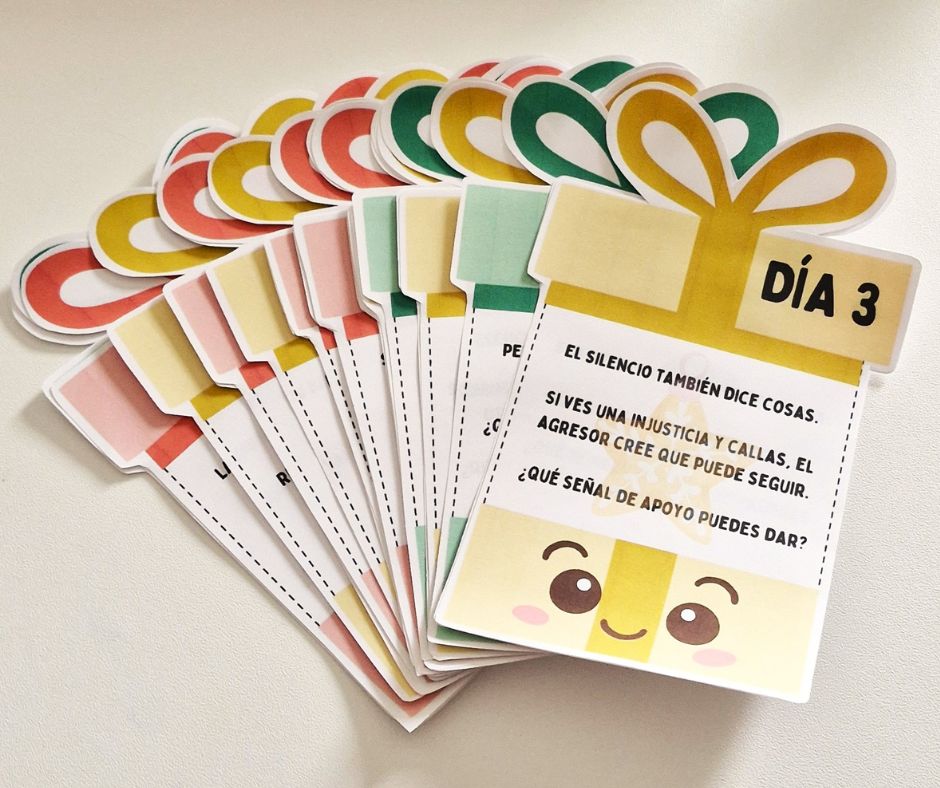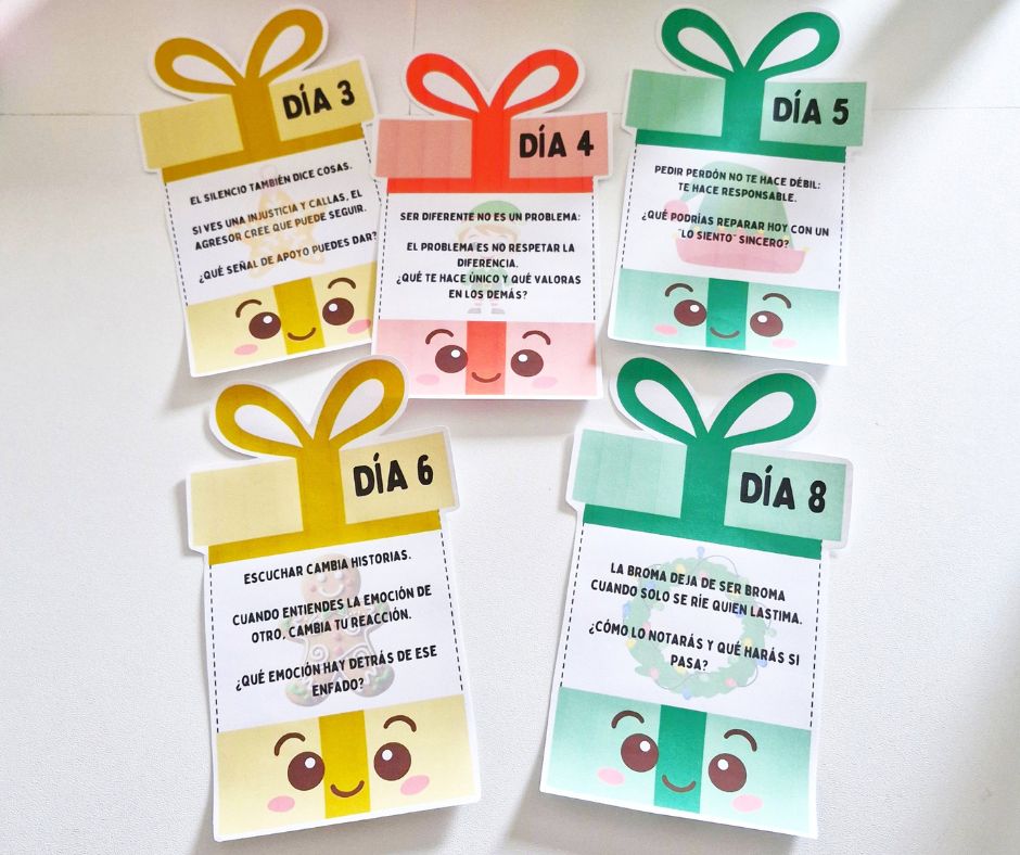 Un calendario con «regalos» imprimibles con 24 frases-reflexión (una por día) que invitan a hablar sobre convivencia, empatía, valentía, límites sanos, redes sociales y apoyo entre iguales. Ideal para convertir diciembre en un entrenamiento diario de buenas prácticas.